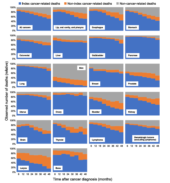 - Non-cancer-related disease death increased over time, from 10.2% at 6 months to 31.6% at 4 years post-diagnosis.
