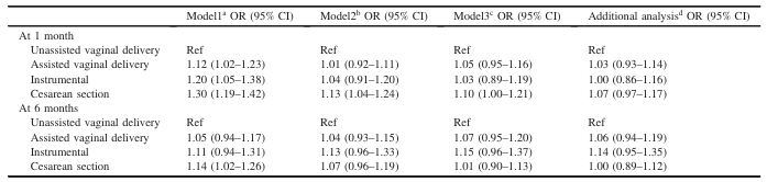 - Cesarean section was marginally associated with PPD at 1 month, but not at 6 months.